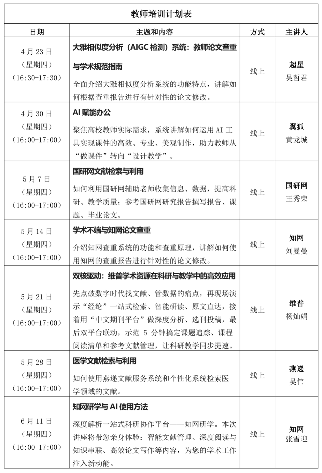 根据图书馆2025-2026学年第二学期工作安排,为了让教师能够了解图书馆的服务内容、掌握部分资源和平台的内容和使用方法、避免在科研写作中出现学术不端现象,图书馆将于本学期的4月份、5月份和6月份面向教师开展7场线上培训。现将培训相关事项公布如下: