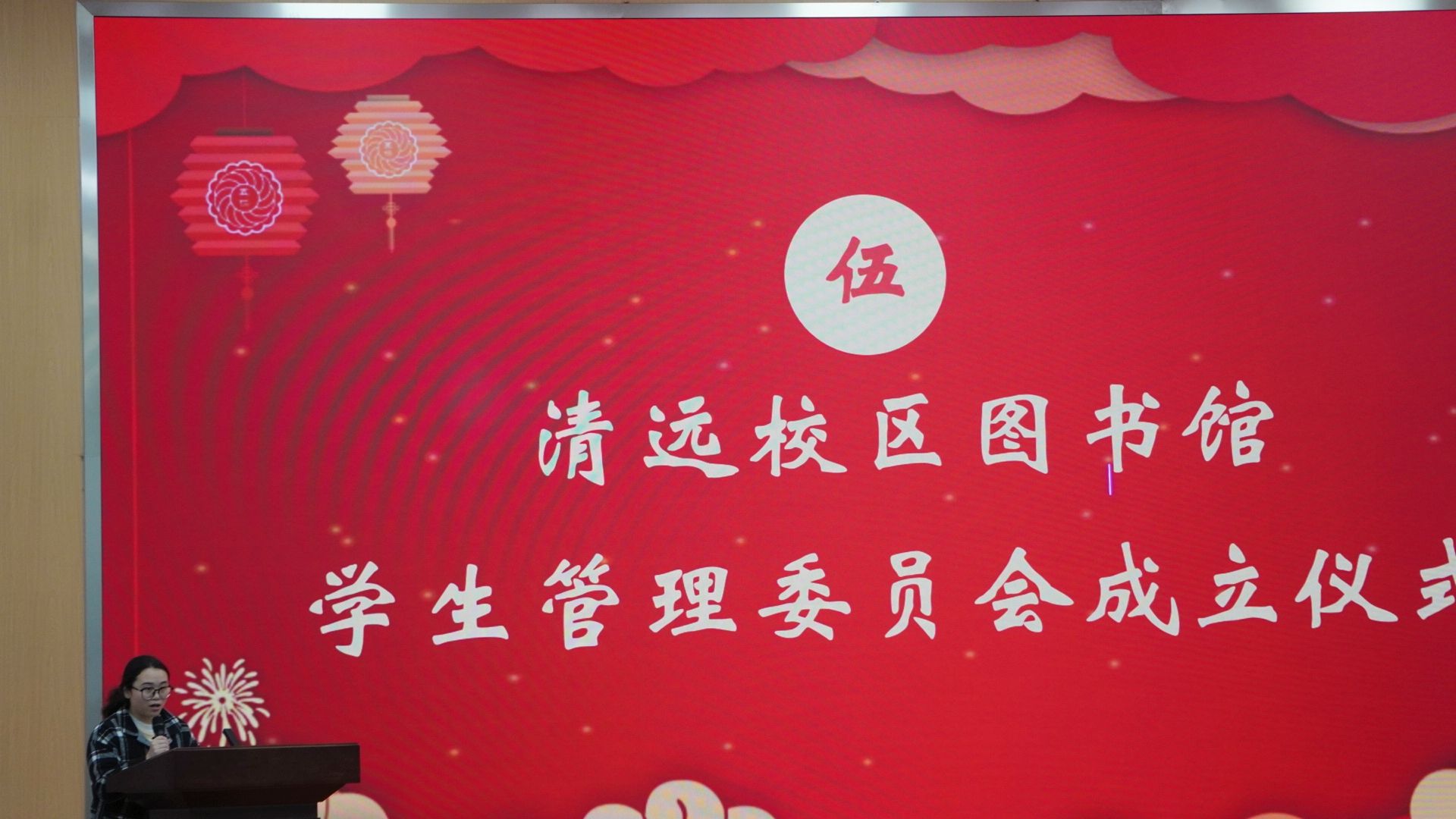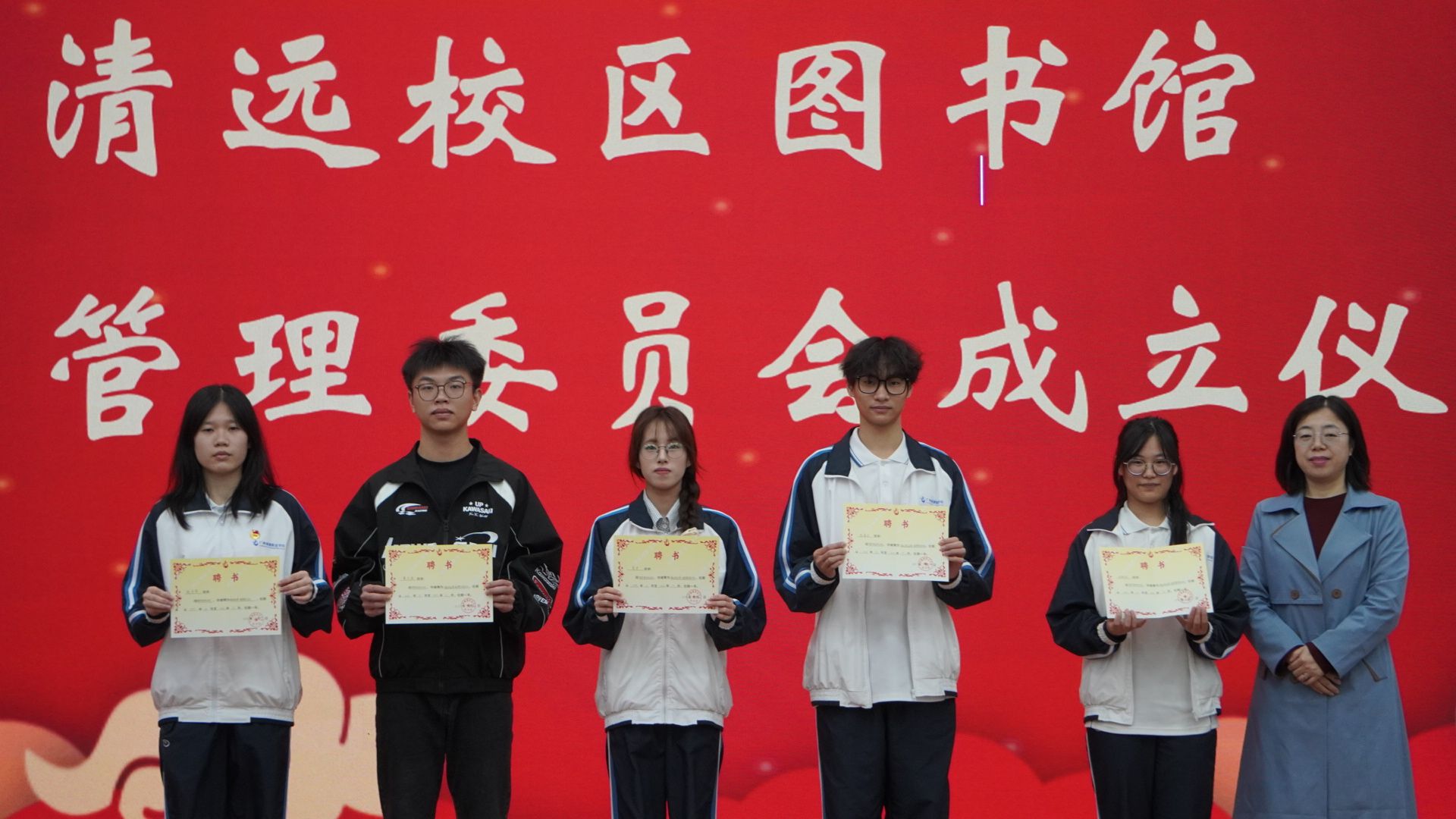 会议迎来具有历史意义的重要时刻——读者服务部主任舒湘正式宣布清远校区图书馆学生管理委员会成立,并庄严宣读首届会长团任命决定。在热烈的掌声中,薛丽荣向会长团成员逐一颁发聘书。鲜红的聘书承载着信任与责任,也标志着图管会正式踏上征程。首届图管会会长陈子琴上台发言,表达了带领团队服务读者、建设书香校园的决心。