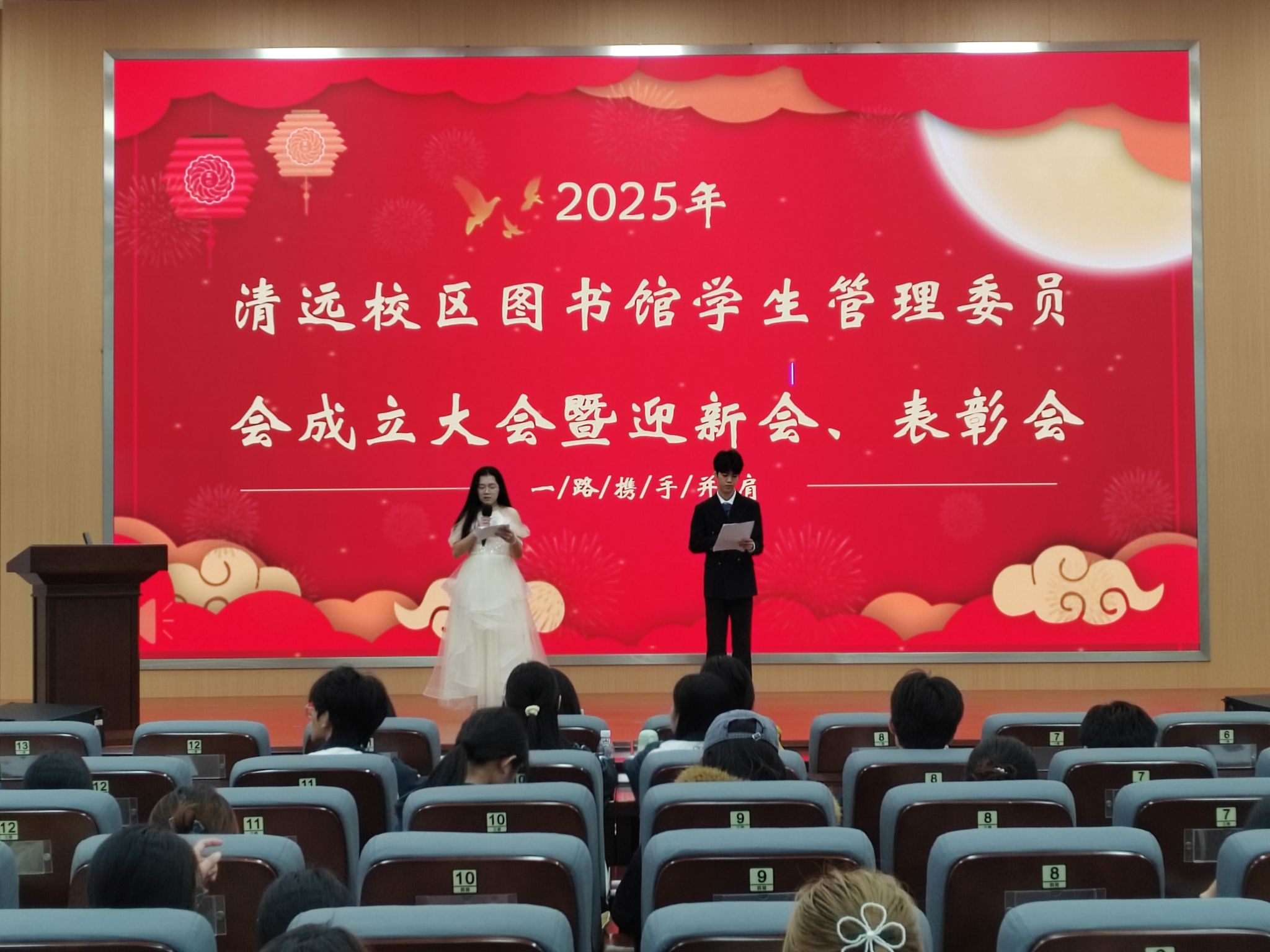 冬日暖阳,书香氤氲。2025年12月23日中午,清远校区图书馆414报告厅洋溢着青春的热情与暖意——清远校区图书馆学生管理委员会成立大会暨迎新会、表彰会在此举行。图书馆副馆长薛丽荣、清远校区图书馆老师和全体勤工助学与志愿者同学齐聚一堂,共同见证这一重要时刻。
