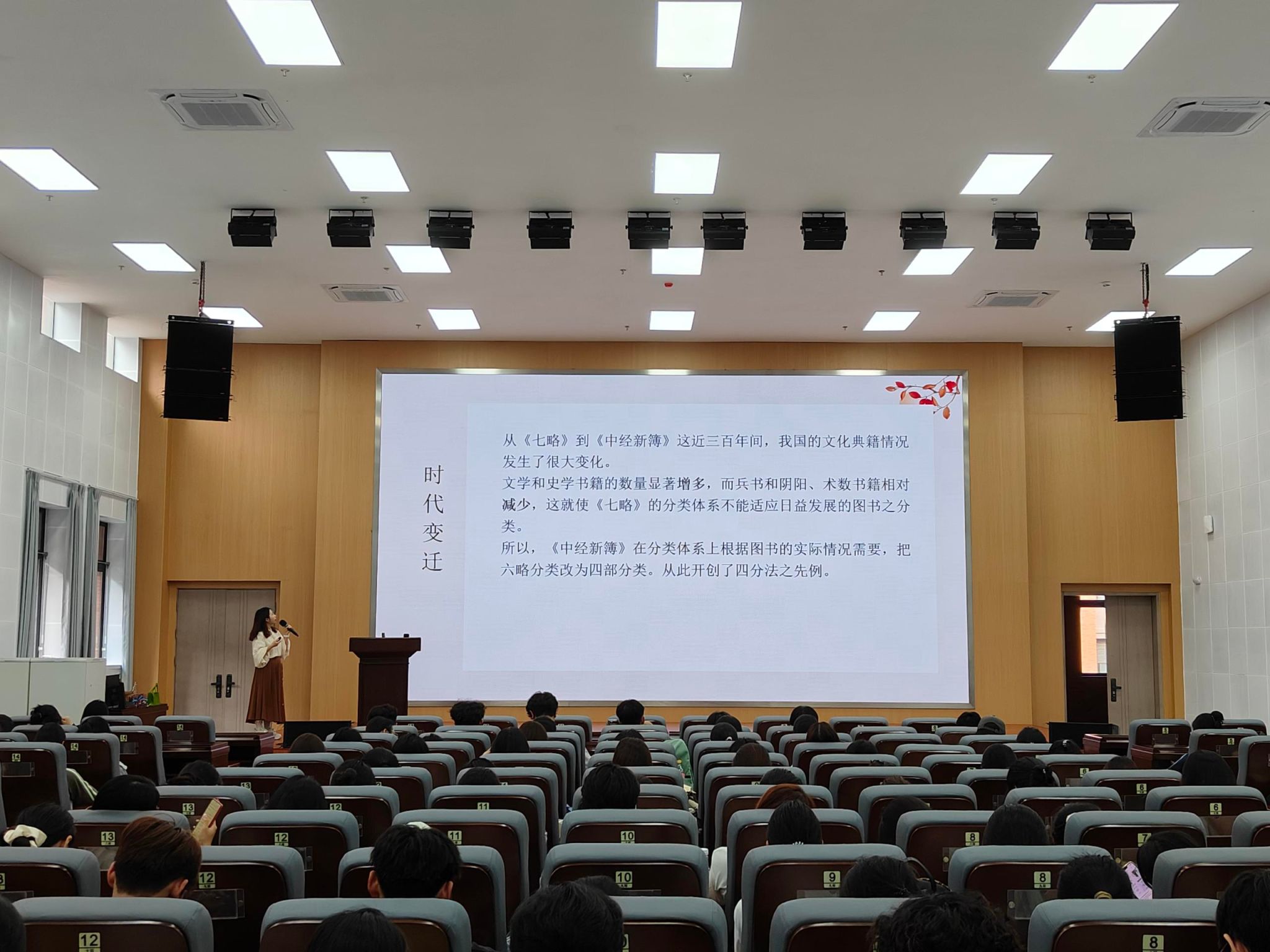 在清远校区414报告厅,郭欢老师带领同学们开启了一场穿越时空的文化之旅。从七略到四部分类法,从《汉书·艺文志》到《四库全书》,郭老师以生动的讲述,将古代学者管理“大数据”的智慧层层展开,揭示了古籍分类背后深藏的文化逻辑与学术思想。郭老师以古籍实景图片为引,带领同学们触摸历史的温度。中国古代图书分类法不仅是对知识的整理,更是对中华学术源流的精神描摹。