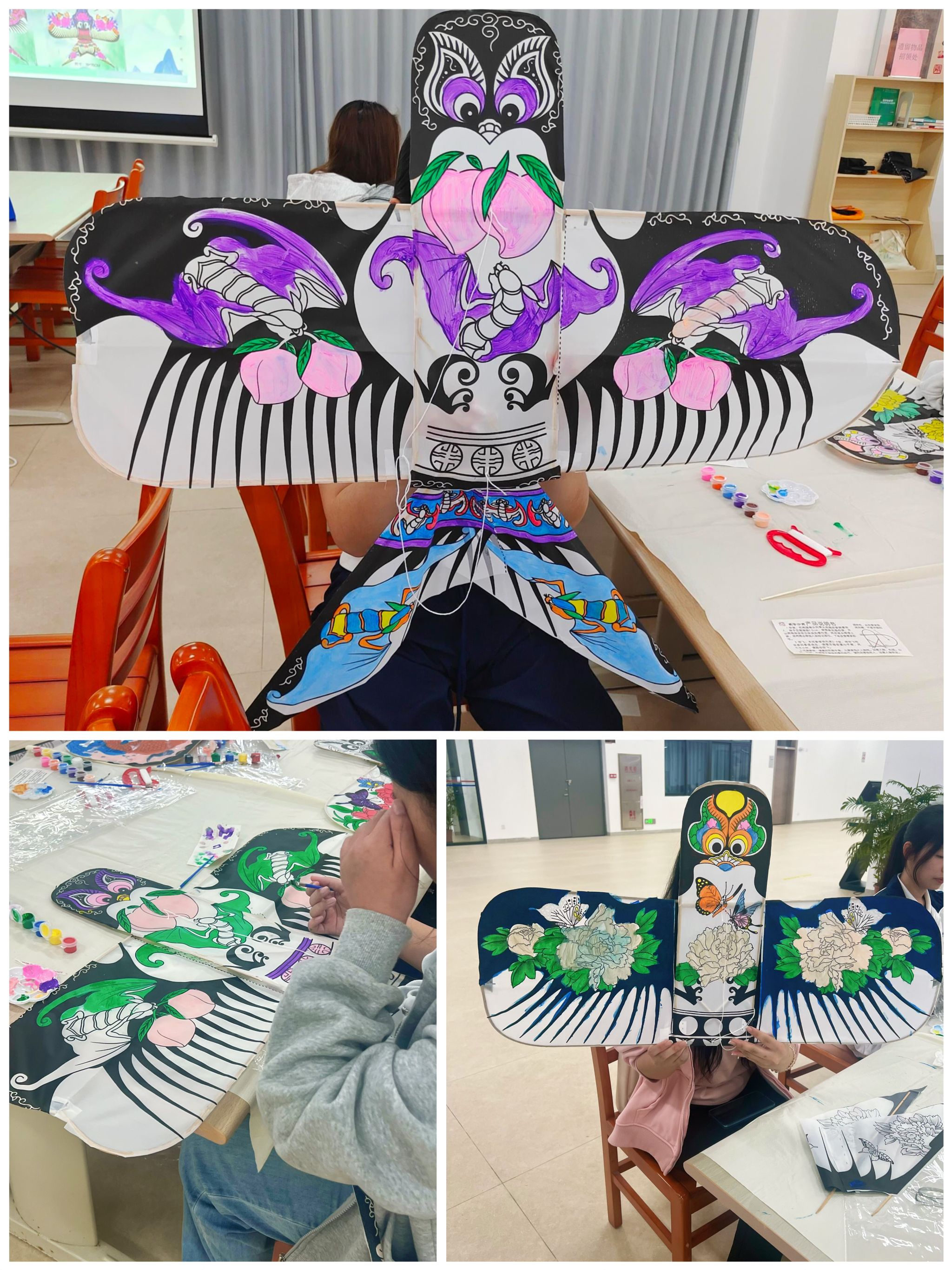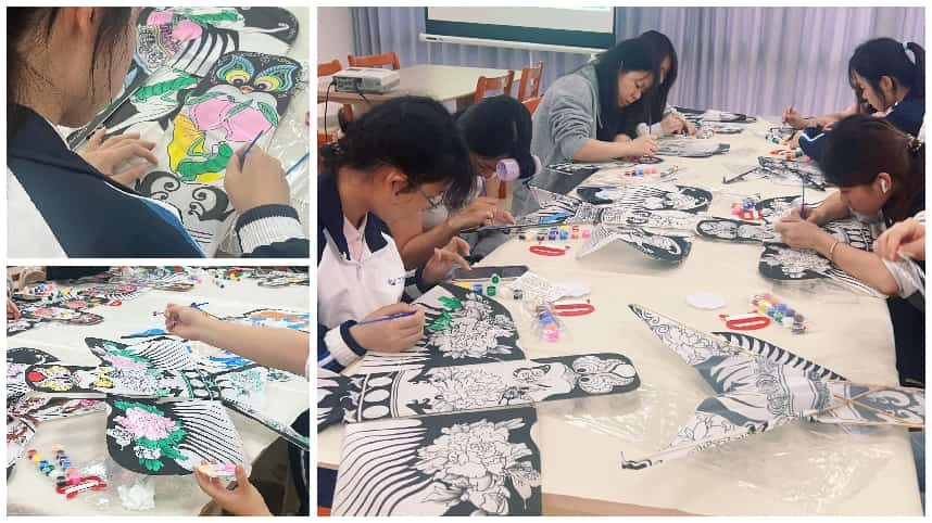 随后,同学们接过印有锦鲤、蝴蝶、燕子等纹样的半成品纸鸢,先轻巧地完成骨架组装,再执笔蘸彩,细心为图案点染上色。笔尖游走间,素白的纸面渐渐鲜活,一只只纸鸢仿佛被唤醒了灵魂。